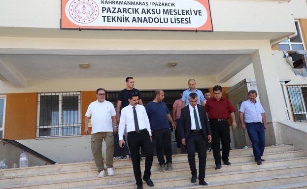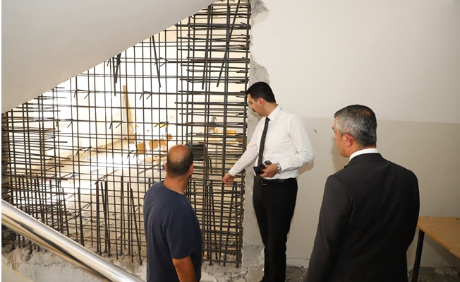 Pazarcık Kaymakamı Hulusi Teke, ilçede devam eden okul güçlendirme çalışmalarını yerinde inceledi.