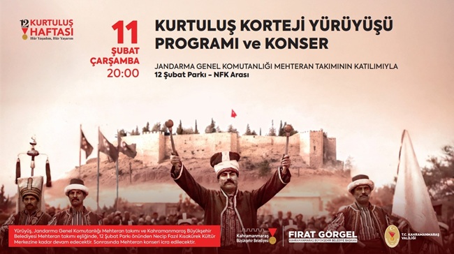 11 Şubat Çarşamba günü, Jandarma Genel Komutanlığı Mehteran Takımı’nın katılımıyla Kurtuluş Korteji Yürüyüşü Programı ve Konser etkinliği ile şehrin bağımsızlık ruhu meydanlara taşınacak. Şehir protokolünün de katlımı ile saat 20.00’da 12 Şubat Parkı’ndan Necip Fazıl Kısakürek Kültür Merkezi’ne kadar kortej yürüyüşü düzenlenecek. Yürüyüş sonrası ise mehteran konseri düzenlenecek. Yürüyüş boyunca vatandaşlar ellerinde Türk bayrakları ve meşalelerle kurtuluş coşkusuna ortak olacak.