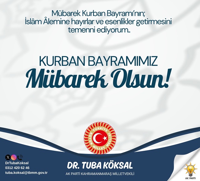 Kurban Bayramı dolayısıyla mesaj yayımlayan AK Parti Kahramanmaraş Milletvekili Tuba Köksal, Kurban Bayramı’nın Türkiye’ye ve İslam alemine sağlık, huzur ve bereket getirmesi temennisinde bulundu.