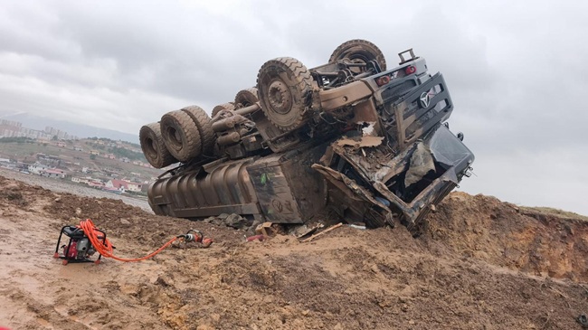 Edinilen bilgilere göre, 31 Ocak 2026 günü saat 15.45 sıralarında taş ocağından aldığı molozları taşıyan kamyonun frenlerinin tutmaması sonucu sürücü direksiyon hâkimiyetini kaybetti. Kontrolden çıkan kamyon, şantiye yolunun kenarında bulunan toprak birikintisine çarparak devrildi.